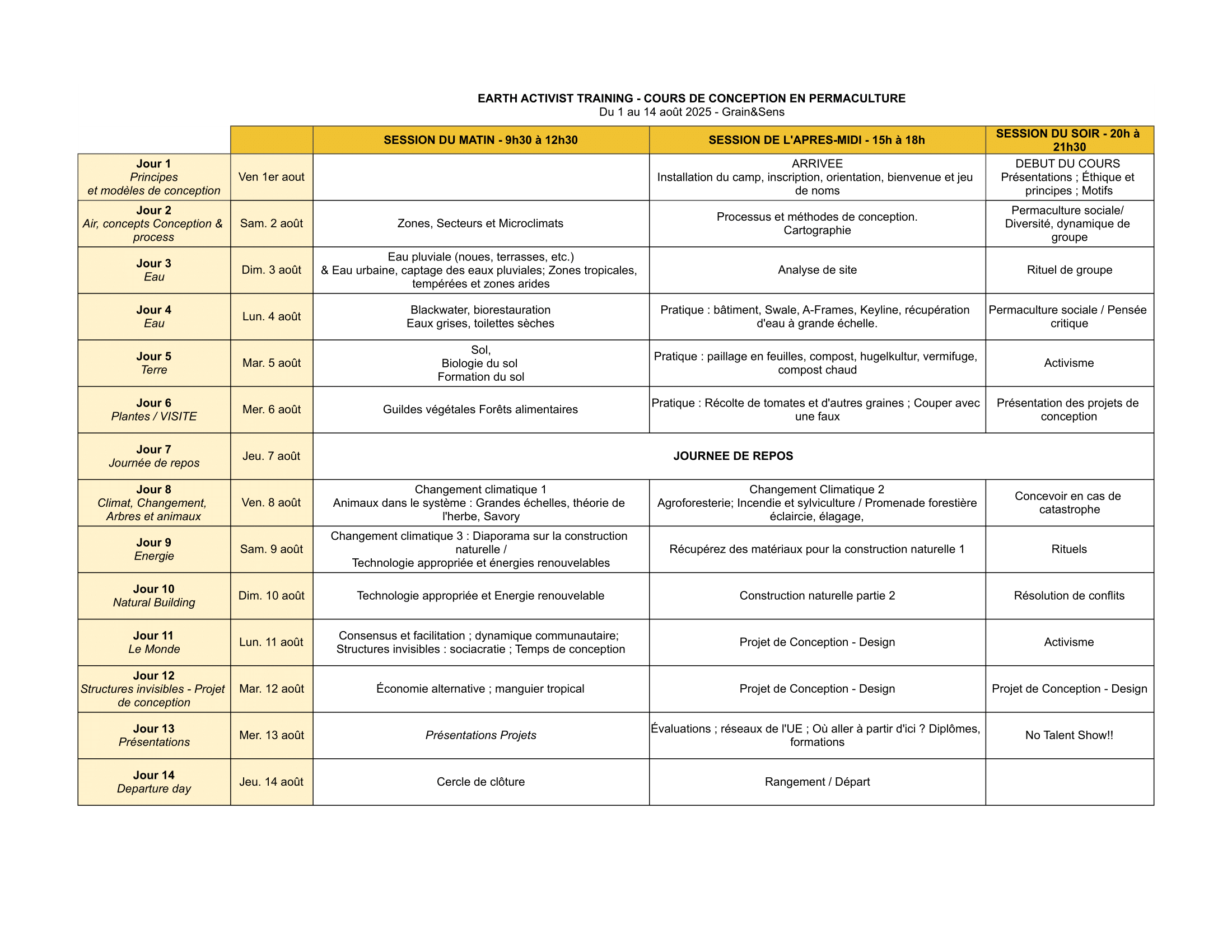 Earth Activist Training (EAT) est un cours intensif combinant théorie et apprentissage pratique. La formation complète permet aux participants d'obtenir un certificat de conception en permaculture (CCP) - la base pour poursuivre le travail et les études en permaculture et une condition préalable au diplôme en conception en permaculture. Les participants apprendront les principes et techniques de conception de la permaculture. Le cours comprend des sessions de formation, des discussions, un apprentissage pratique, des diaporamas, des rituels en lien avec la terre et des projets de conception. Nous examinerons les hypothèses sous-jacentes à la culture actuelle de consommation et de mondialisation économique, et encouragerons l'exploration de moyens de contribuer à l'émergence d'une culture régénérative, de compassion et d'équité. Le CCP couvre un large éventail de sujets pour fournir un aperçu holistique des systèmes de permaculture et de la vie durable. Certains des sujets/thèmes à aborder sont :