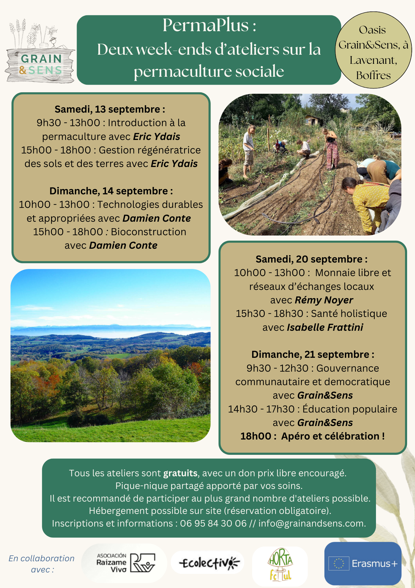 Possibilité de rester en bénévolat durant la semaine entre les deux week-end (PermaCamp avec chantiers).